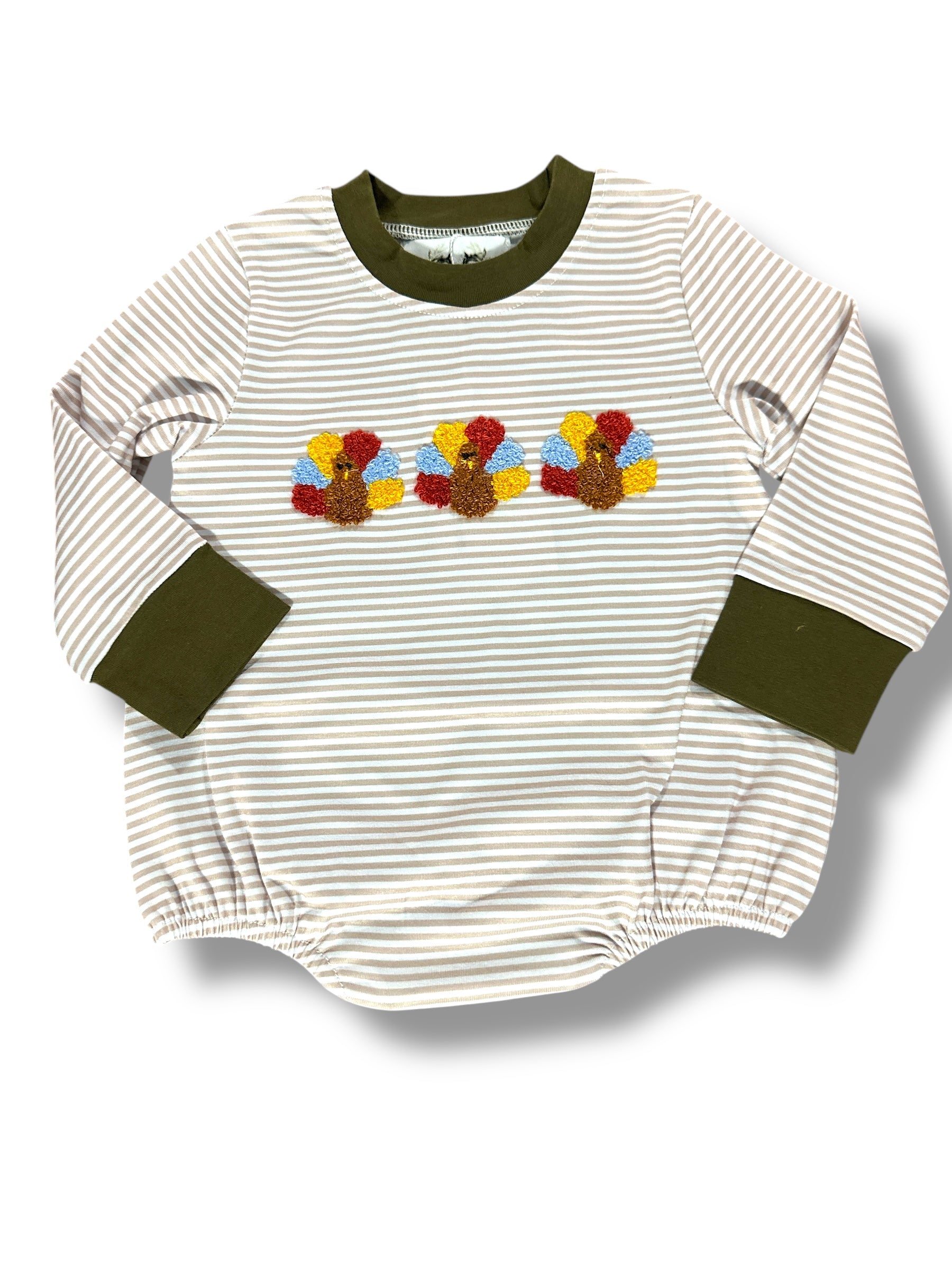 Add a playful touch to your little boy’s wardrobe with this French Knot Turkey Bubble. Featuring charming hand-stitched turkey details on a striped background, this cozy outfit combines comfort with whimsical style, perfect for fun-filled days and festive occasions.