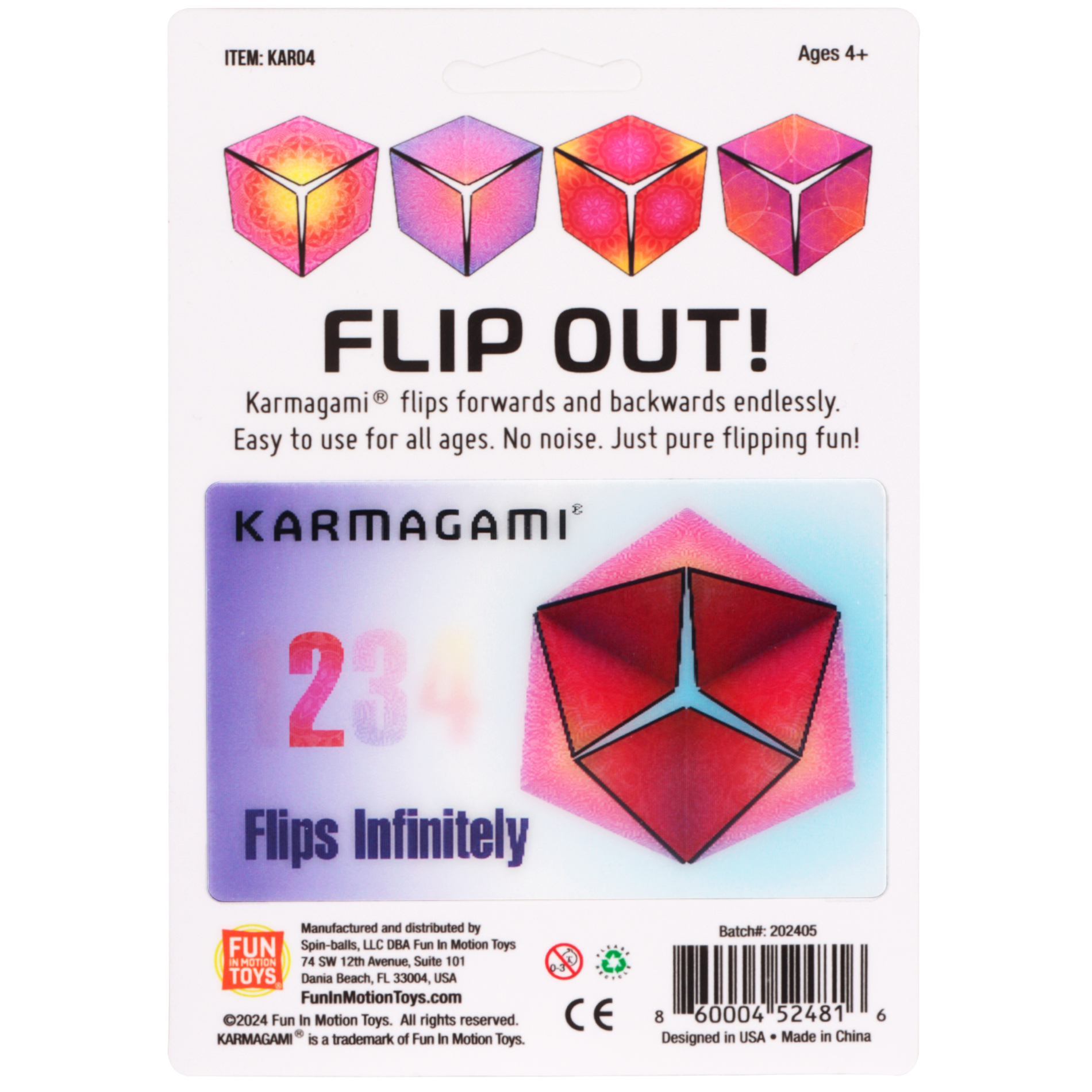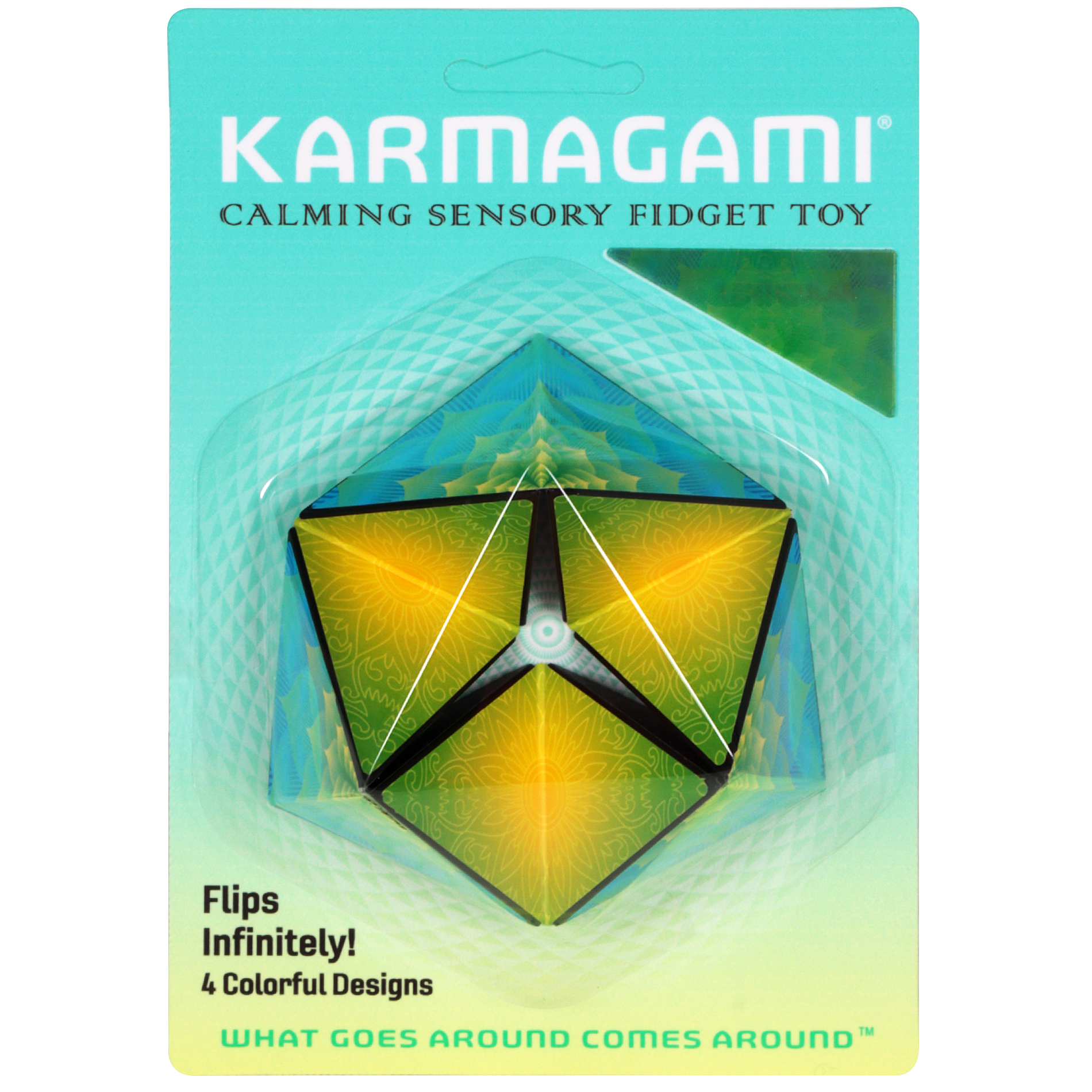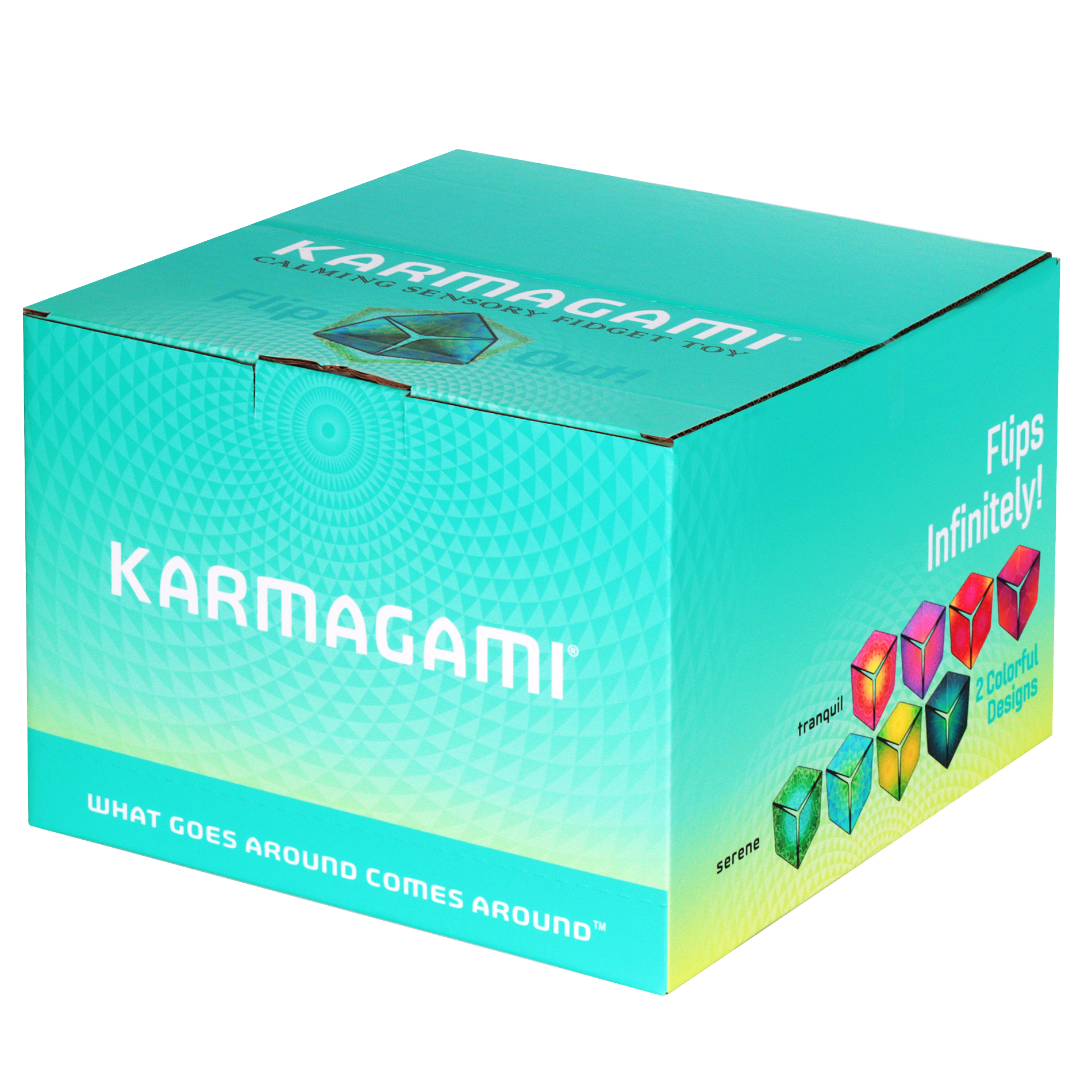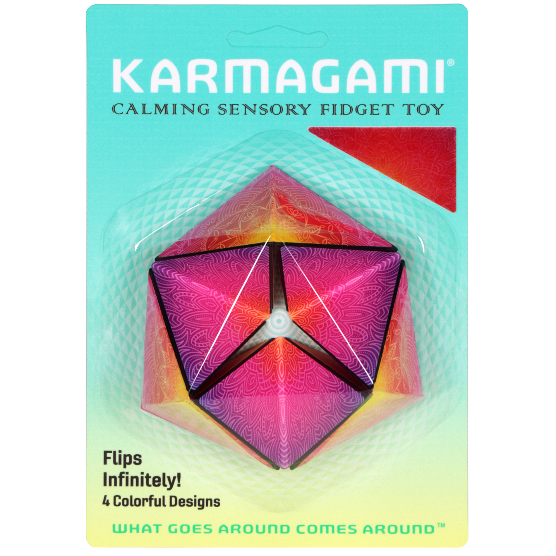 We are excited to introduce our new colors for Karmagami - Tranquil and Serene. Karmagami is our calming fidget toy that flips infinitely - rotating and transforming seamlessly into 4 colorful designs like a kaleidoscope. It helps calm the mind and is great for kids and adults who constantly fidget. Anyone can flip it forwards and backwards endlessly. It’s easy to use for all ages! No noise. No gimmicks. Just pure flipping fun!