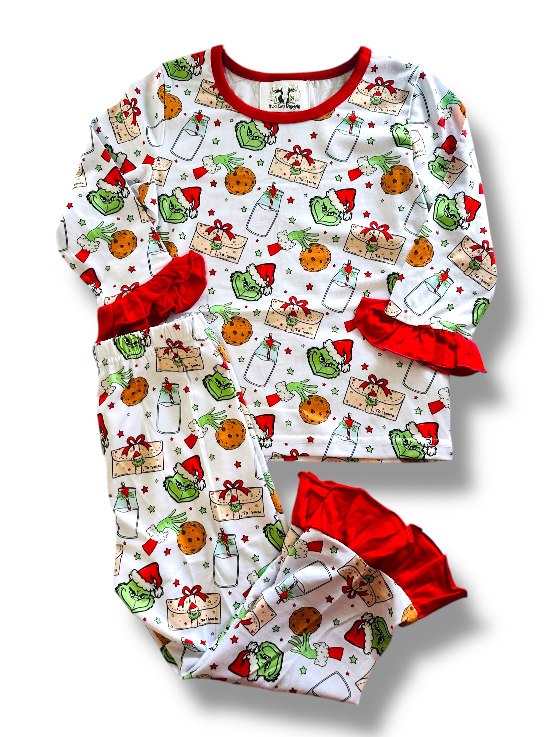 Get cozy in style with the Mean One Lounge Girls set, featuring a playful Grinch-themed milk and cookies print. Perfect for relaxed days at home, this lounge set combines comfort and fun, making it ideal for holiday lounging or gifting. Soft fabric and a cheerful design bring festive spirit to your downtime.